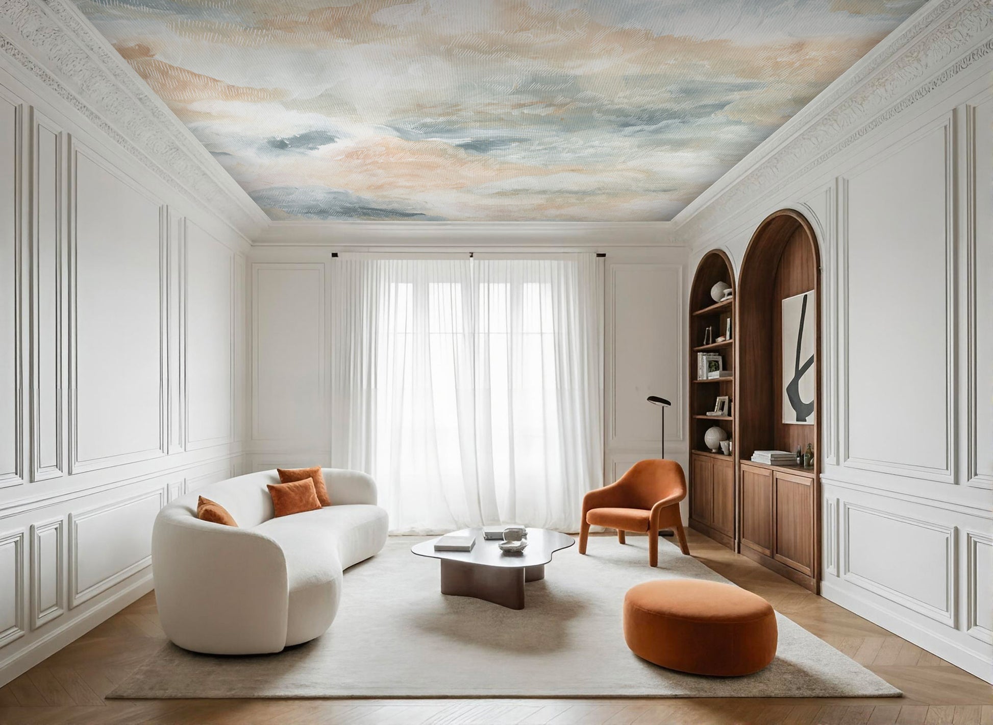 Ce papier peint panoramique, peint à la gouache, évoque un ciel tout en douceur : nuageux, mouvant, apaisant. Les couleurs se fondent délicatement, comme une brise légère qui passe entre les rideaux. On y retrouve la sensation d’un moment suspendu, quelque part entre rêve et réalité, lorsque le ciel se couvre sans jamais s’assombrir. Un décor aérien et poétique, pour inviter la sérénité dans votre intérieur.